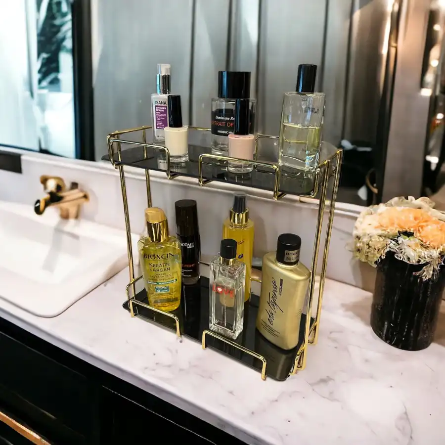 2 Katlı 28x14 Gold Banyo ve Kozmetik Düzenleyici, şıklığı ve işlevselliği bir araya getirir. İki katlı tasarımı sayesinde banyo veya kozmetik ürünlerinizi düzenlemek için idealdir. Altın rengi ile lüks bir görünüm sunarak, ev dekorunuza zarif bir dokunuş katar. Ayrıca, sunum ve servis tepsisi olarak da kullanılabilir.