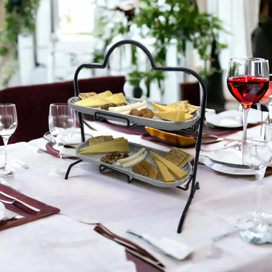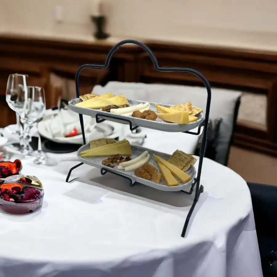 2 Katlı Beyaz Gümüş Zemin Mermer Desenli Melamin 13x32cm Metal Sunum Standı – İkram ve Servis İçin Model 1 Siyah