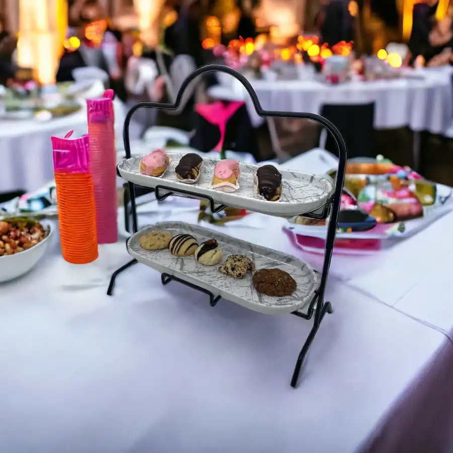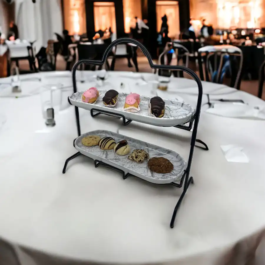 2 Katlı Beyaz Gümüş Zemin Mermer Desenli Sunum Standı, şık ve modern tasarımıyla ikram ve servislerinizi göz alıcı bir şekilde sunmanızı sağlar.