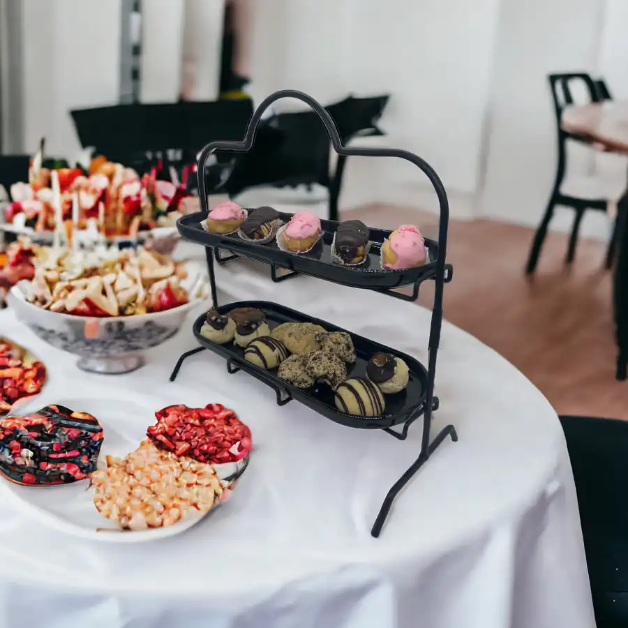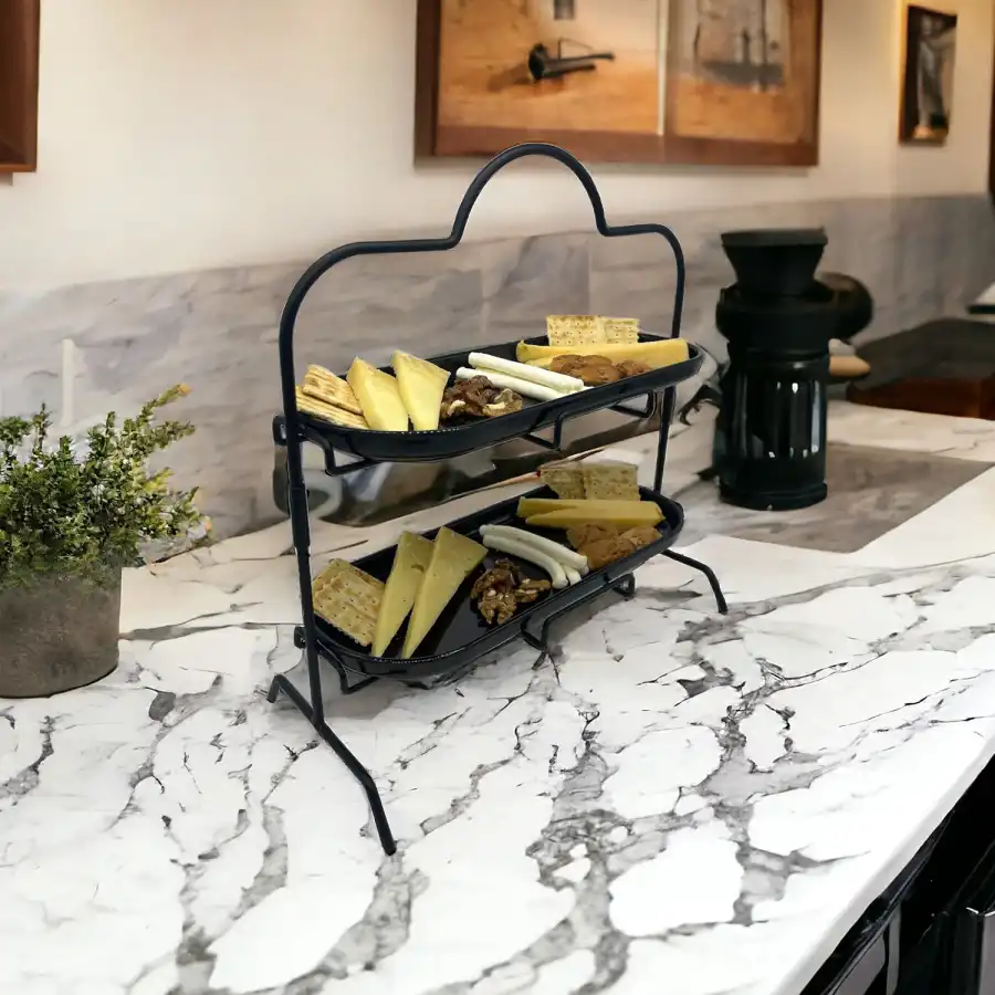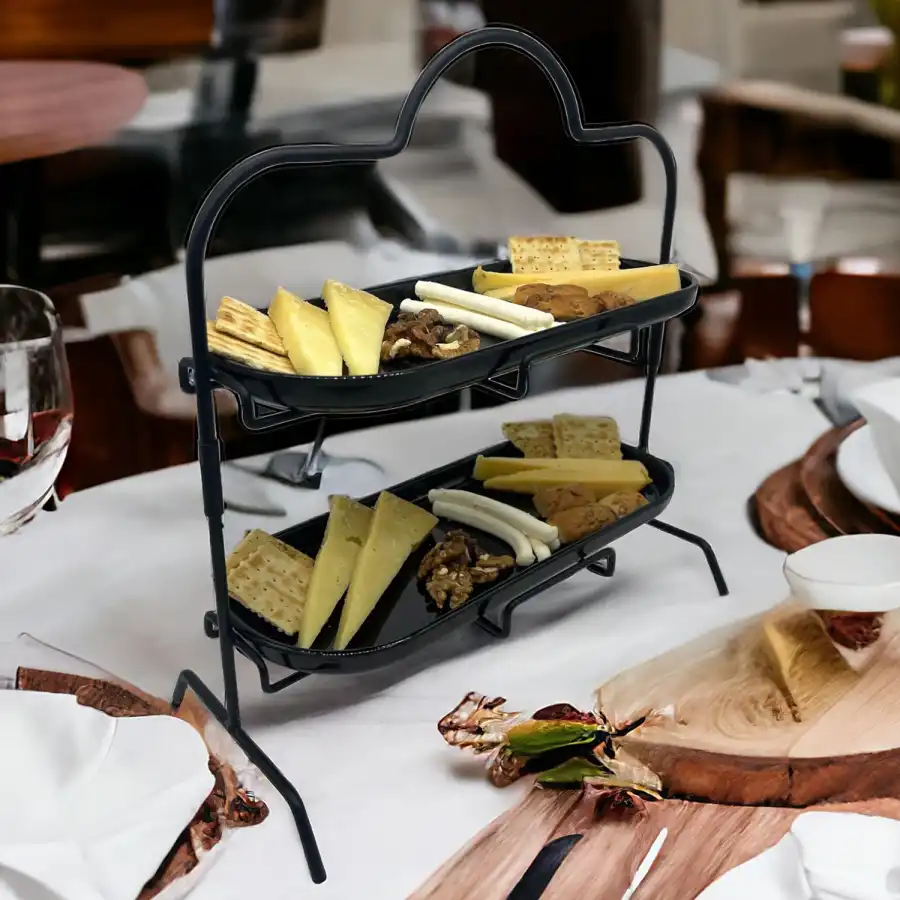 2 Katlı Siyah Melamin Metal Sunum Standı, şıklığı ve pratikliği bir arada sunarak ikramlarınızı göz alıcı hale getirir. Modern tasarımıyla evde veya profesyonel mekanlarda mükemmel bir seçimdir.