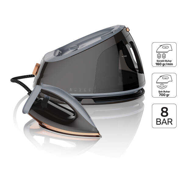 Gelince Haber Ver8 bar güçlü buhar basıncı ve 700 g/dk şok buhar gücüyle en inatçı kırışıklıkları bile kolayca açın. 1,5 litrelik çıkarılabilir su tankı, otomatik kapanma ve Turbo Boost teknolojisi ile ütü deneyiminizi zahmetsiz ve kesintisiz hale getirin.