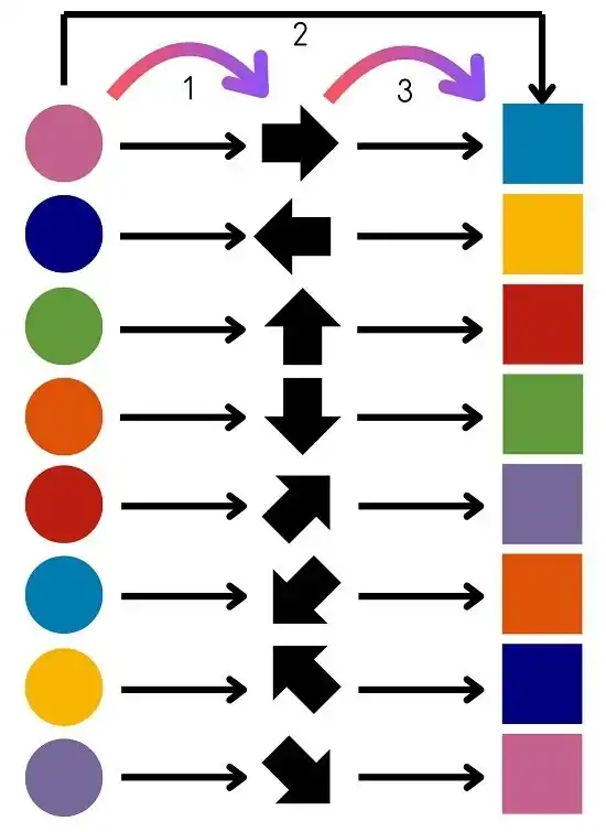 - Toplamda 8 farklı renkten 2’şer adet olacak şekilde 16 adet kare parça ve 8 adet ok bulunur, parça kenarı 2.5 cm’dir.