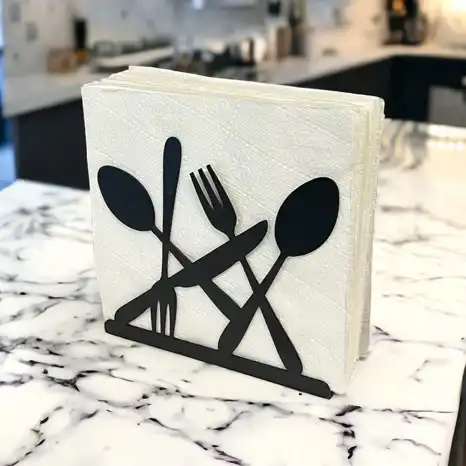 Sofranıza modern bir dokunuş katmak için tasarlanmış olan bu şık peçetelik, zarif çatal, kaşık ve bıçak motifleriyle dikkat çekiyor. Metal yapısı sayesinde dayanıklıdır ve uzun ömürlü kullanım sunar. Peçetelerinizi düzenli bir şekilde saklarken, masaüstünüzde estetik bir görünüm sağlar. Yemek davetlerinizde misafirlerinizin beğenisini kazanacak bu peçetelik, her türlü mutfak dekorasyonuna uyum sağlar. Ücretsiz kargo fırsatıyla hemen sipariş edin!
