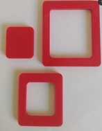 2 adet delikli, 1 adet deliksiz kırmızı renkli kare, sarı renkli yuvarlak ve mavi renkte üçgen parçalar mevcuttur.