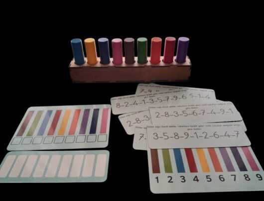 İçinde farklı renklerde toplam 9 adet olacak şekilde 2 cm çapında, 8 cm boyunda silindirler mevcuttur.